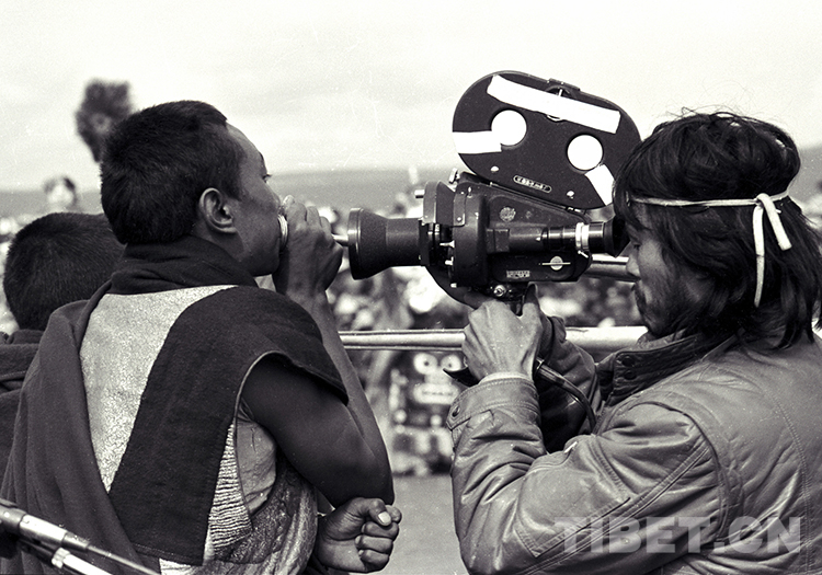 這是北京科學(xué)教育電影制片廠《萬(wàn)里藏北》攝制組導(dǎo)演忻迎一,在那曲賽馬會(huì)上拍攝吹長(zhǎng)號(hào)的僧人(唐召明1988年攝)