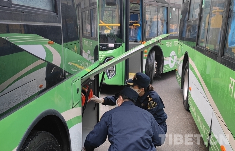 圖為拉薩海關(guān)所屬聶拉木海關(guān)監(jiān)管驗(yàn)放出口國(guó)產(chǎn)新能源公交車 由拉薩海關(guān)供圖