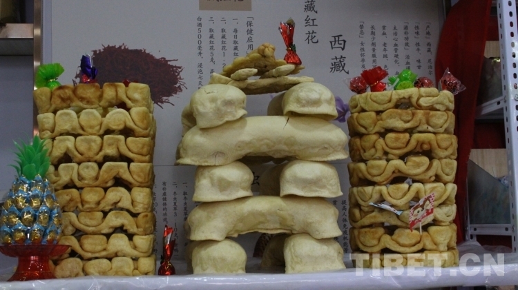 圖為年貨市場(chǎng)里擺放的“德嘎”樣式(是由形狀不同的油炸面食壘起來(lái)的供品) 攝影:次旦拉姆