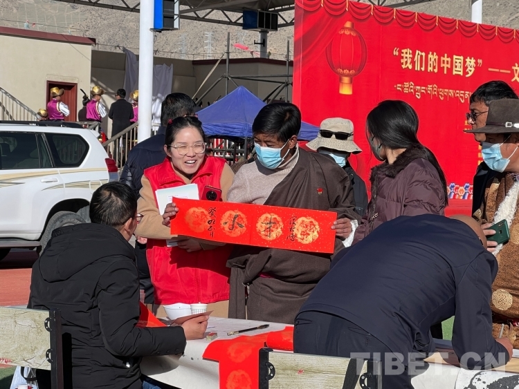 圖為書(shū)法家為群眾書(shū)寫(xiě)新年祝福(書(shū)寫(xiě)內(nèi)容:扎西德勒) 攝影:德吉卓瑪