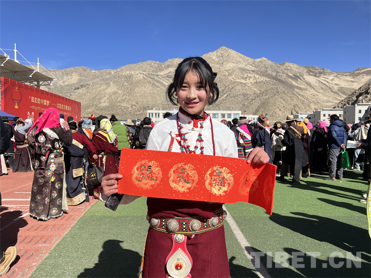 來到送“書法”現(xiàn)場,書法家們?cè)缭绲貋淼交顒?dòng)現(xiàn)場,他們準(zhǔn)備筆墨、鋪開紙張,為現(xiàn)場群眾書寫藏、漢文新年對(duì)聯(lián),“福”字、“吉祥如意”、“扎西德勒”等寓意美好的祝福。書法家協(xié)會(huì)副主席祖牛拉巴次仁說:“從春節(jié)開始,我們書法家們?nèi)W(xué)校、社區(qū)、搬遷安置點(diǎn)等地,書寫了超過1萬件的書法作品。這些作品深受大家的喜愛,我們后續(xù)也會(huì)繼續(xù)開展送‘書法’公益活動(dòng)”?,F(xiàn)場群眾聚集在送“書法”現(xiàn)場,“西熱措姆”“張文青”“索朗旺青”“朗嘎達(dá)瓦”……孩子們爭先恐后請(qǐng)書法家把自己的名字寫在紅紙上?!斑@是我的名字,我爸是西寧人,我媽是那曲的,我們是從那曲安多縣搬遷過來的,我現(xiàn)在在森布日幸福中學(xué)上初三,將來要考那曲高級(jí)中學(xué)”張文青拿著書家贈(zèng)給她的“名字”用流利的那曲話對(duì)記者說。