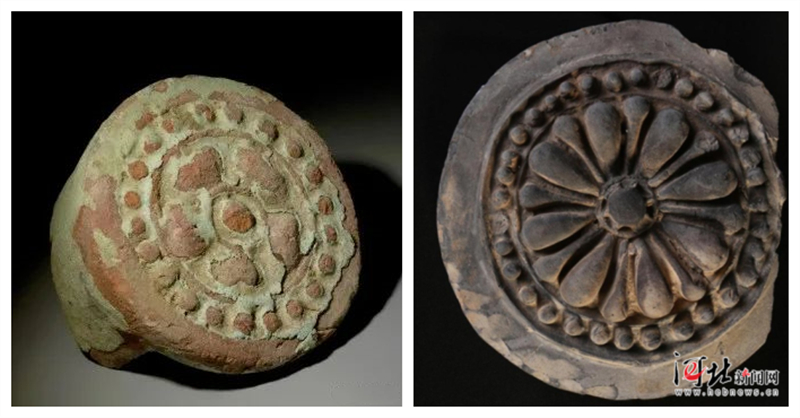 圖為西藏曲水溫江多遺址出土的綠釉紅陶帶筒瓦蓮花瓦當(dāng)(左圖片來源:國家文物局)與河北正定開元寺附近出土的唐代蓮花紋瓦當(dāng)(圖右圖片來源:燕趙都市報(bào))紋樣對比