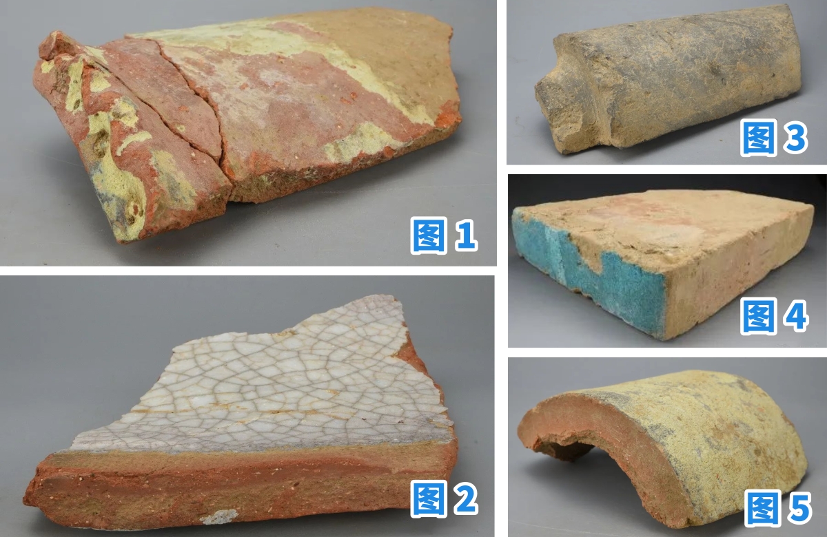 圖為西藏曲水溫江多遺址出土的各種建筑材料,圖1為綠釉紅陶花口板瓦殘塊、圖2為白釉紅陶板瓦殘塊、圖3為帶刻痕帶瓦舌灰陶筒瓦殘塊、圖4為藍(lán)釉琉璃磚、圖5為綠釉紅陶筒瓦殘塊 圖片來源:國家文物局供圖拼合