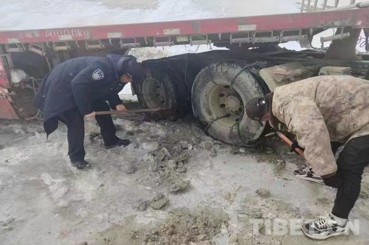 民警抵達(dá)現(xiàn)場(chǎng),首先確認(rèn)了司機(jī)身體狀況良好。在了解情況后,與司機(jī)共同對(duì)車輛開(kāi)展救援工作。經(jīng)過(guò)一段時(shí)間努力,仍無(wú)法將被困車輛拖離被困地。經(jīng)與司機(jī)協(xié)商決定,先行將其帶至曲松鄉(xiāng)妥善安頓,而后協(xié)調(diào)駐地友鄰單位用重型車輛救援被困車輛。最終在友鄰單位的幫助下,被困近20小時(shí)的半掛車成功脫困。