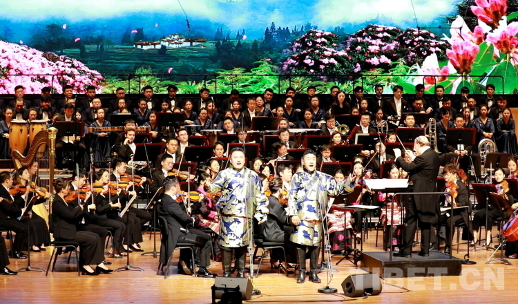 圖為音樂會引子部分,由西藏自治區(qū)藏劇團(tuán)藏戲表演藝術(shù)家、國家一級演員班典旺久(前排左二)演繹的藏戲唱腔《祝?!?,藏戲司鼓為西藏自治區(qū)藏劇團(tuán)藏戲司鼓演奏家、國家一級演員扎西旺杰(前排左一) 西藏自治區(qū)黨委宣傳部供圖