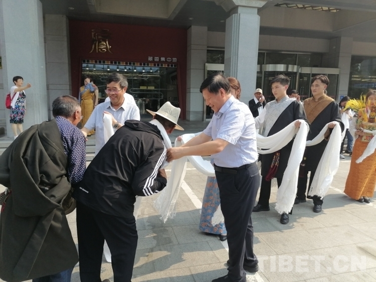 圖為北京建藏援藏工作者協(xié)會(huì)相關(guān)負(fù)責(zé)人為西藏村居兩委基層干部赴京考察學(xué)習(xí)團(tuán)獻(xiàn)上哈達(dá) 攝影:王茜