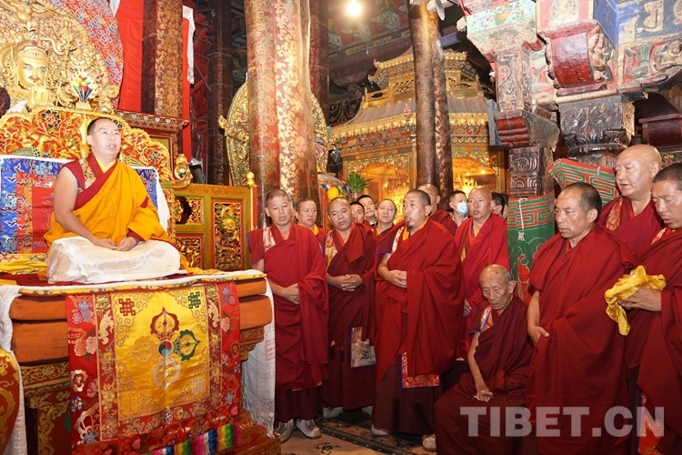 大昭寺大殿的主殿內(nèi),供奉有唐代文成公主帶入雪域高原的釋迦牟尼十二歲等身佛像。班禪入內(nèi),虔誠(chéng)而莊重地向佛像叩頭朝拜、敬獻(xiàn)哈達(dá)。隨后,班禪登上該殿對(duì)面的法座,面朝釋迦牟尼十二歲等身佛像,帶領(lǐng)僧眾念誦經(jīng)文,祈愿國(guó)泰民安、風(fēng)調(diào)雨順。禮佛結(jié)束后,班禪為大昭寺僧眾摸頂賜福。