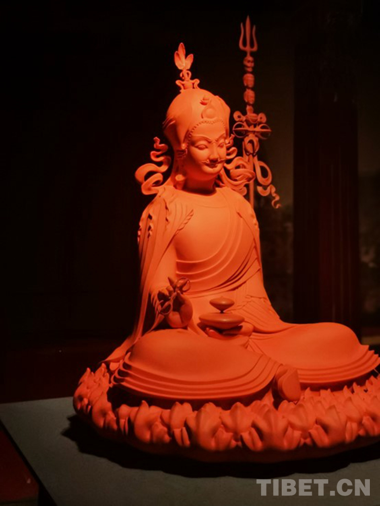 展覽還特別呈現(xiàn)了一件蓮花生大師坐像,回應(yīng)西藏歷史傳統(tǒng)中對(duì)智慧的尊崇。該作品座高一米,通體以紅色琉璃塑造,與古建筑廊道中清代晚期民眾面對(duì)外敵來襲、出于樸素愛國熱情而繪制的蓮花生大師壁畫形成呼應(yīng)。