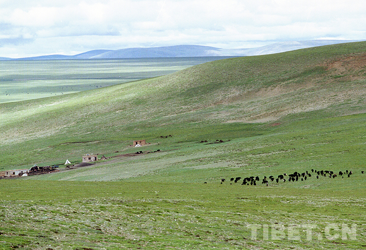 在雙湖特別區(qū)(現(xiàn)雙湖縣)草原上放牧的牦牛群與牧民人家(唐召明2001年攝)