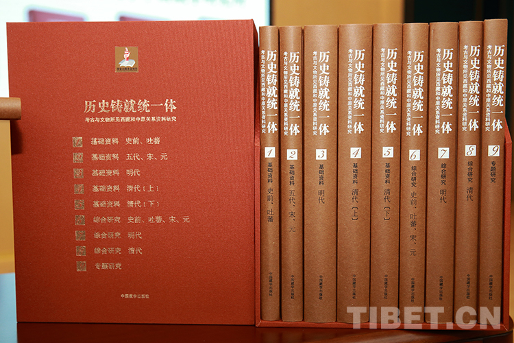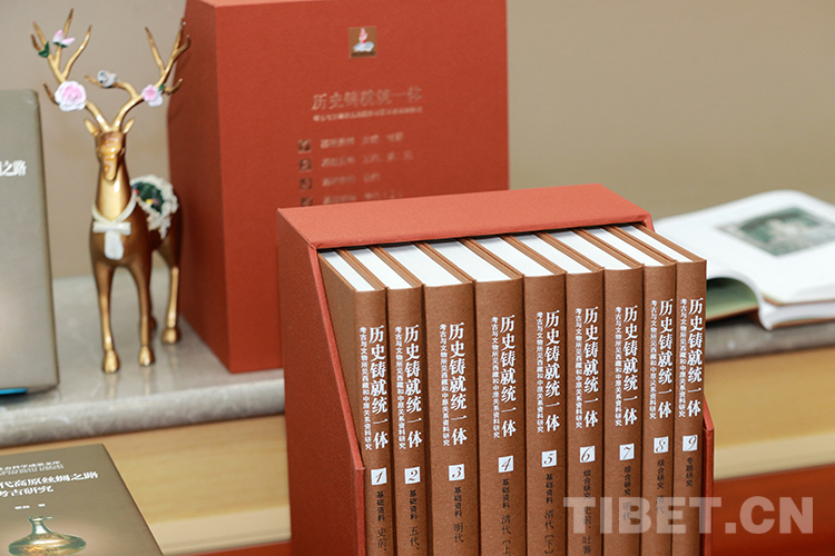 圖為發(fā)布會(huì)現(xiàn)場展覽的《歷史鑄就統(tǒng)一體:考古與文物所見西藏和中原關(guān)系資料研究》全套圖書 攝影:陳衛(wèi)國