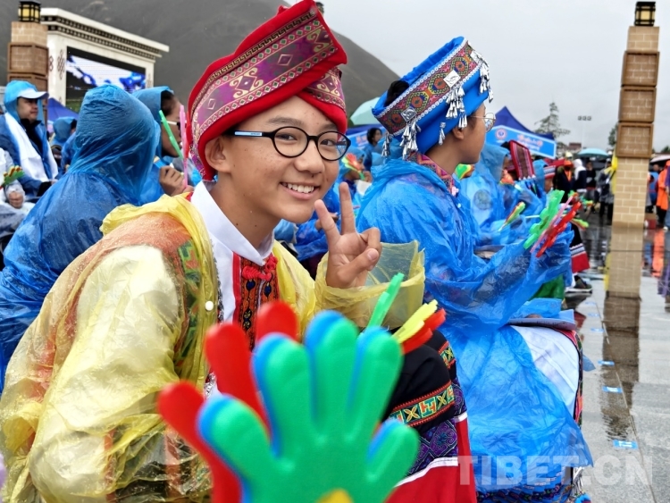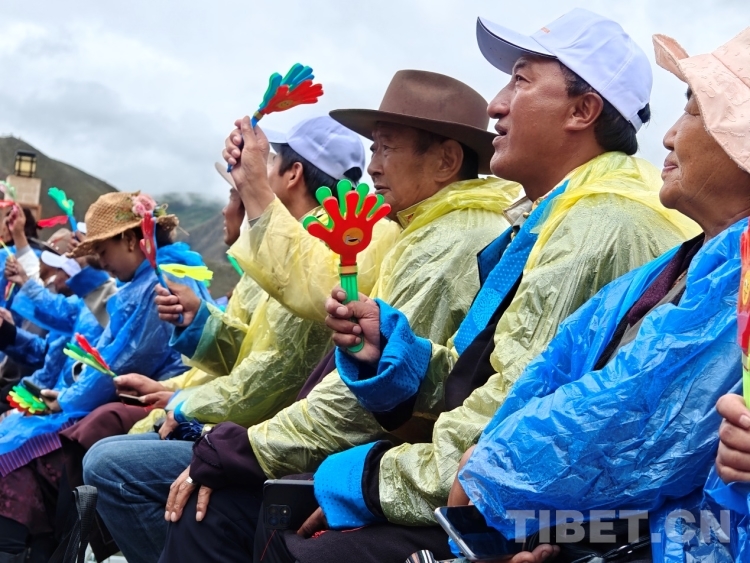 當(dāng)天上午,雨水時(shí)急時(shí)緩下著。當(dāng)?shù)孛癖姄沃鴤?、披著雨衣早早落座等待演出開始。白瑪次仁是附近的村民,他告訴記者:“我平時(shí)就喜歡唱歌和跳舞,所以收到有文藝演出的通知就早早過來觀看,畢竟平時(shí)很少看到如此大型的演出。”