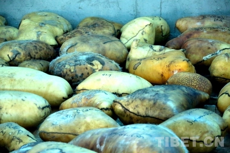 一袋袋用牛羊肚包裹的“酥油磚”整齊碼放在倉(cāng)庫(kù)的一角,黃澄澄、金燦燦。每個(gè)上面寫著一串藏文,里面包含了誰(shuí)家生產(chǎn)的,公斤數(shù)、生產(chǎn)日期等信息。