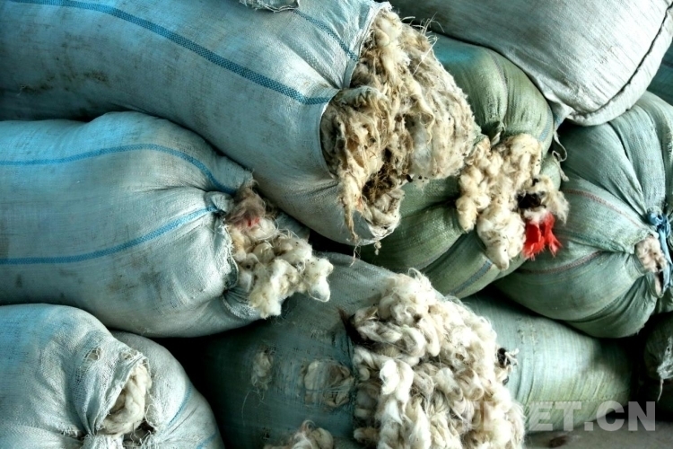 圖為在茶措村扶貧集體經(jīng)濟(jì)合作社倉(cāng)庫(kù)內(nèi)擺放的羊毛 攝影:王佳豪