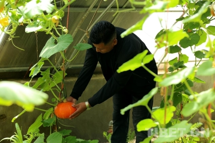 圖為吾金次仁向記者展示即將成熟的南瓜 攝影:王佳豪