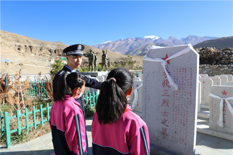 圖為在普蘭縣烈士陵園,民警向?qū)W生們講述烈士的感人事跡