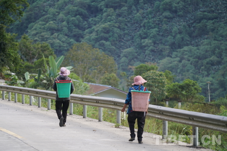 圖為行走在墨脫縣德興鄉(xiāng)鄉(xiāng)間公路上的村民,她們依然保留著背東西的習慣 攝影:趙振宇
