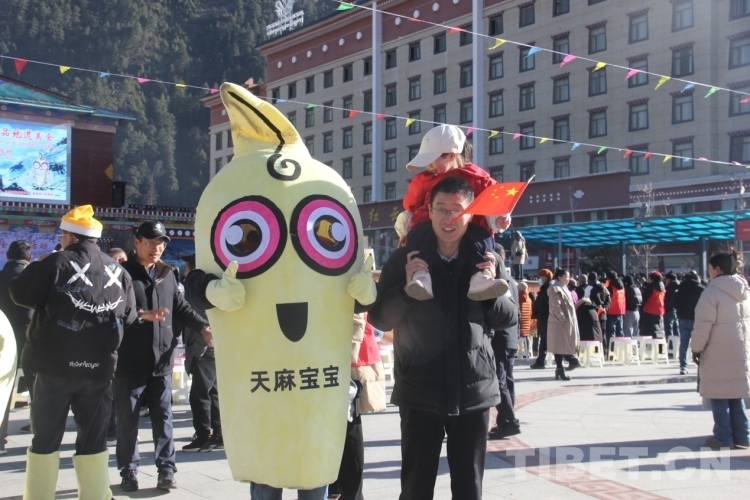 圖為開幕式現(xiàn)場(chǎng)觀眾與天麻寶寶合影 攝影:旦曲