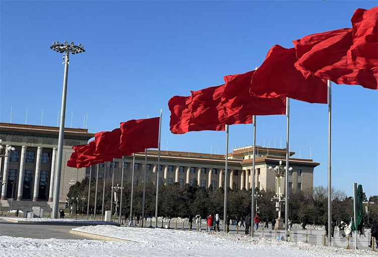 圖為天安門(mén)廣場(chǎng)上迎風(fēng)飄揚(yáng)的紅旗 攝影:王妍丹