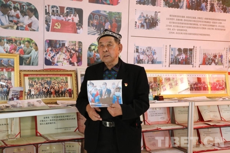 在講述故事的時(shí)候,沙勒克江·依明老人總是把腰背挺得直直的,雙眼的目光有神而堅(jiān)定,說(shuō)話吐詞帶有重音和落地實(shí)感。當(dāng)他拿起照片,講起自己觀看天安門廣場(chǎng)的升旗儀式時(shí),他會(huì)用腳一聲一聲地踏出聲音,沉浸描述當(dāng)時(shí)國(guó)旗班的腳步聲帶給他的心靈震撼。而隨著他的動(dòng)作,我們的身心也顫抖了起來(lái)。