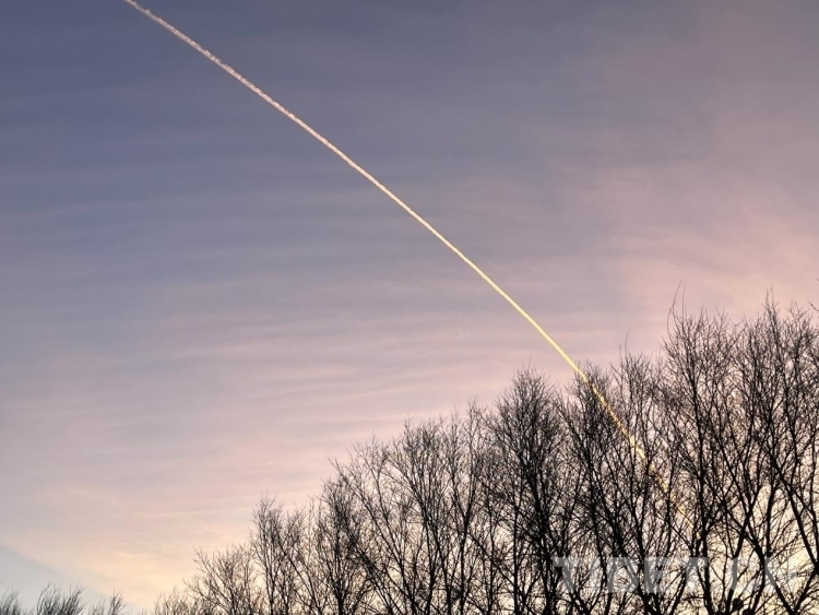 圖為飛機(jī)越過(guò)粉藍(lán)間接的日出天空 攝影:王妍丹