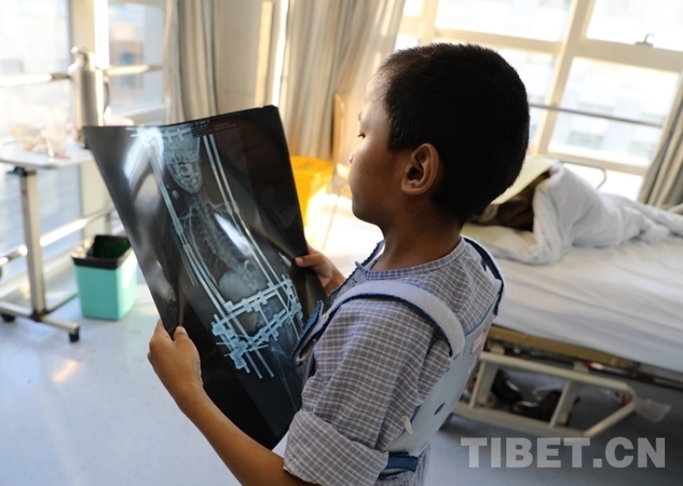 病房內,9歲的扎西曲培已經完成了手術,在病房里奔走玩耍。他煞有介事地拿起自己的x光片,說“這是我的,快治好的?!崩畲镜抡f,“這個小男孩調皮得很,天天很活躍,眼睛里都是機靈。剛來的時候他肩膀一個高一個低,肩胛骨也不對稱,如今走路的時候形態(tài)完全正常,身高長了12公分,因為年齡小,將來恢復估計會更好一些?!?/p>