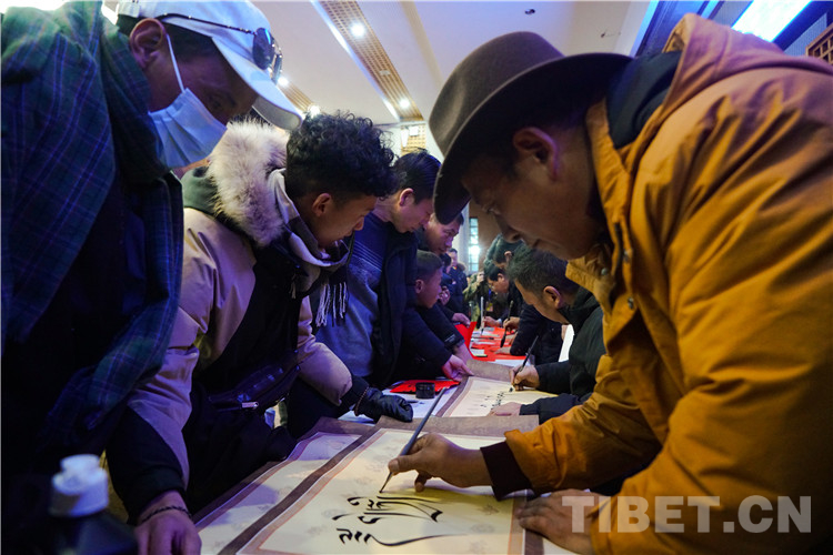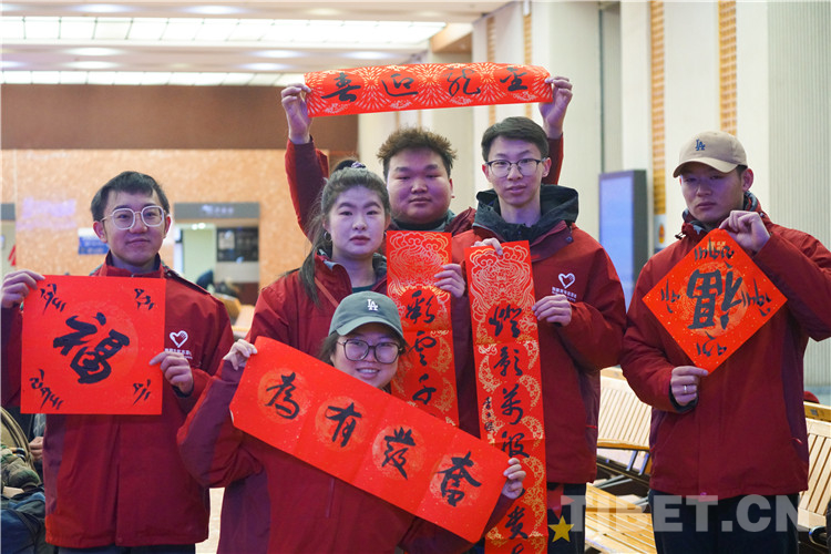 圖為春運(yùn)首日拉薩站向旅客免費(fèi)贈送漢藏春聯(lián)及書法作品 攝影:趙振宇
