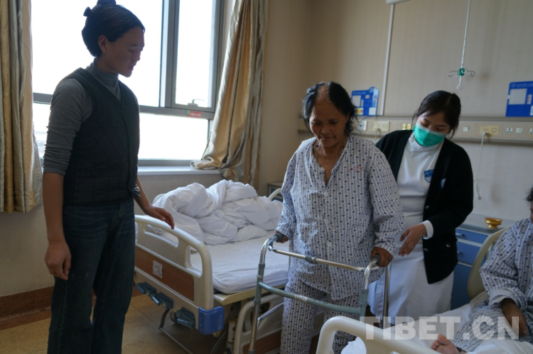 “卓瑪,你快給媽媽翻譯一下,用扶手架轉(zhuǎn)身的時(shí)候90度慢慢轉(zhuǎn),不要一次性轉(zhuǎn)180度,容易摔倒。”骨關(guān)節(jié)科護(hù)士薛小英從剛剛的驚慌中回過神來(lái),對(duì)著29床病人布姆的女兒大聲叮囑道。就在剛才,這個(gè)來(lái)自洛隆縣59歲的右膝大骨節(jié)病患者布姆在骨關(guān)節(jié)手術(shù)24小時(shí)后,借助扶手架,在護(hù)士的指導(dǎo)下已經(jīng)能夠下床走路了。只是初次使用扶手架還不太熟悉,剛才180度的大轉(zhuǎn)彎讓一旁陪護(hù)的護(hù)士不禁捏了一把汗。女兒卓瑪聽到護(hù)士的話后趕忙告訴媽媽走路轉(zhuǎn)身要慢點(diǎn),小心別摔倒。