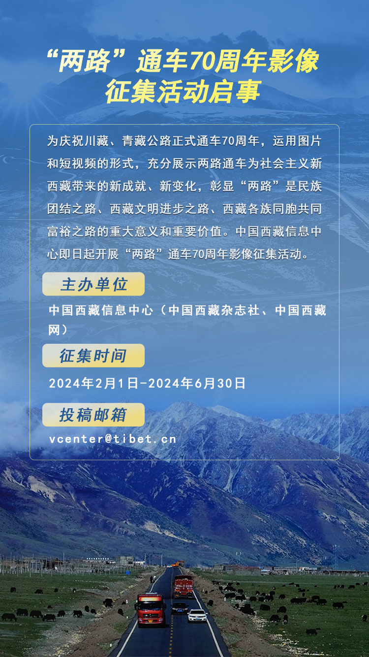 為慶祝川藏、青藏公路正式通車70周年,運(yùn)用圖片和短視頻的形式,充分展示兩路通車為社會(huì)主義新西藏帶來的新成就、新變化,彰顯“兩路”是民族團(tuán)結(jié)之路、西藏文明進(jìn)步之路、西藏各族同胞共同富裕之路的重大意義和重要價(jià)值。中國西藏信息中心即日起開展“兩路”通車70周年影像征集活動(dòng)。