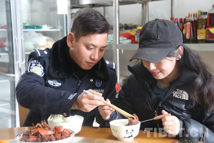 氧氣瓶、高原藥品、熱水......接德吉永措的車上已準備好了各種抗高反和取暖的東西,這讓她提前感受到了來自丈夫單位的熱情與關(guān)懷。與愛人相聚后,旦增洛追帶著妻子參觀營區(qū),迫切地想讓她了解他用青春為之奮斗的警營,隨后他又帶著妻子到單位食堂品嘗自己親自下廚做的紅燒肉?!班牛∥兜篮芎?。”德吉永措吃著丈夫給她夾的肉,臉上洋溢著幸福的笑容。