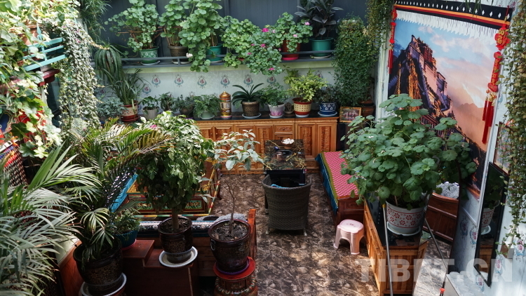 德瓊家庭旅館以女主人次仁德瓊的名字命名。工作人員告訴我們,這里是拉康鎮(zhèn)生意最好的旅館之一。旅館位于兩條主干道交接的拐角,地理位置好,招牌也立得醒目,每個進入鎮(zhèn)子的人第一眼就能看到德瓊家庭旅館的招牌。但生意好絕不僅僅是因為地理位置優(yōu)越。走進這間旅館,如同進入一間溫室花棚。在這里,花草植物是絕對的主角,各色草本、藤本、灌木植物高低錯落,幾乎填滿了墻壁空間。蕭瑟的冬日里,粉的、白的、紅的花朵擠擠挨挨地開著,茉莉、山茶、三角梅...來自不同地域的花卉植物在這邊境小鎮(zhèn)的一隅競相綻放,天南海北在此握手言和。德瓊阿佳用她對生活的熱情將家庭旅館裝點得生機盎然,我想正是這份純真的熱愛才是德瓊家庭旅館生意火爆的關鍵所在。