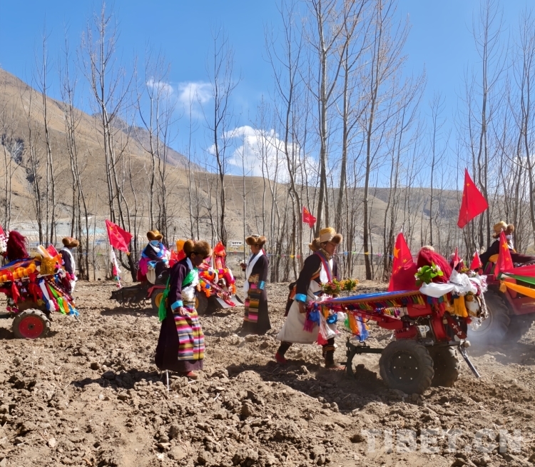 當天,村里的男女老少穿上節(jié)日盛裝,手捧哈達,高舉青稞美酒,從村子的各個角落來到村東頭一塊叫作“聶西滅”的肥沃土地上,男人們駕駛著用彩旗、花束妝點的拖拉機,伴隨著一陣陣轟鳴聲,春耕儀式正式開始。新耕的第一犁,由一個屬相與今年屬相相符的婦女撒出吉祥、幸運的種子,其余的拖拉機一對跟著一對地翻耕,每臺拖拉機后面都跟隨著一位盛裝的婦女,她們左手提一桶種子,右手有節(jié)奏地揮擺,翻出沉寂一冬、透著泥土芬芳的肥沃土地,把種子撒入希望的田野。翻耕結束后,各家各戶把春耕歡慶時用的青稞酒、卡賽、切瑪等擺放在供桌上,孩子們在田間喧鬧戲耍,將村民們其樂融融、喜氣洋洋的美好生活景象體現的淋漓盡致。