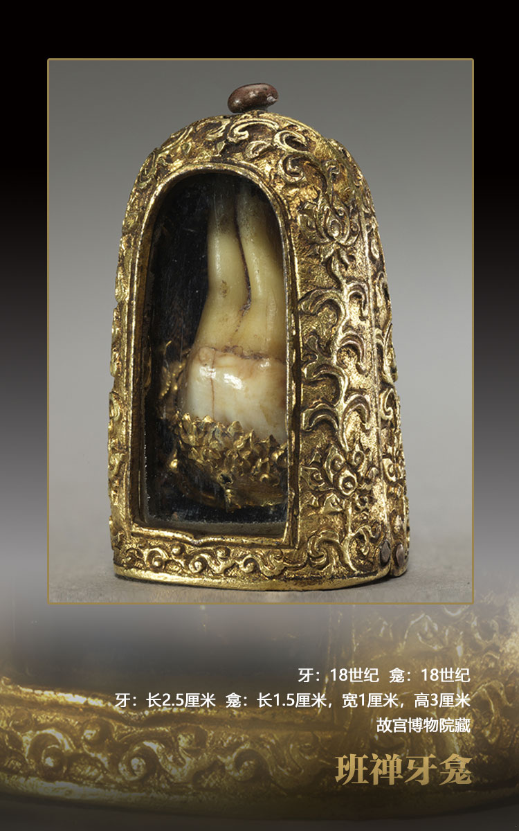 此班禪牙為臼齒一顆,牙根下嵌金屬托,外配隨形玻璃門銅鎏金龕。龕內附黃條:“左銅鍍金小襖鍋一座,內供班臣額爾德尼牙。”