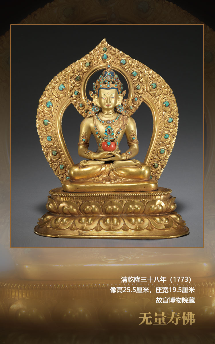這尊造像與其他五十五尊同樣造型的無量壽佛,一同供奉在紫禁城養(yǎng)性殿西暖閣佛堂的一座八面七層的紫檀木佛塔中。根據(jù)《六世班禪洛桑巴丹益希傳》、內(nèi)務(wù)府造辦處《活計(jì)檔》及軍機(jī)處滿文檔案的記載,乾隆帝在乾隆三十五年(1770)寧壽宮區(qū)域營建開始前,即乾隆三十三年(1768)向六世班禪訂做了這五十六尊無量壽佛,佛像圖樣、鑲嵌寶石等材料均為宮廷提供。這些造像于乾隆三十八年完成并送回宮廷,此后一直供奉于養(yǎng)性殿佛堂至今。乾隆四十五年(1780)六世班禪進(jìn)京朝覲,還曾親自瞻仰過此塔此像。故這組無量壽佛,是乾隆時期宮廷審美與扎什倫布寺造像技術(shù)的高度融合,經(jīng)過乾隆帝本人親自設(shè)計(jì),又有明確的制作時間,是清代宮廷造像及扎什倫布寺造像研究的重要標(biāo)型器物。