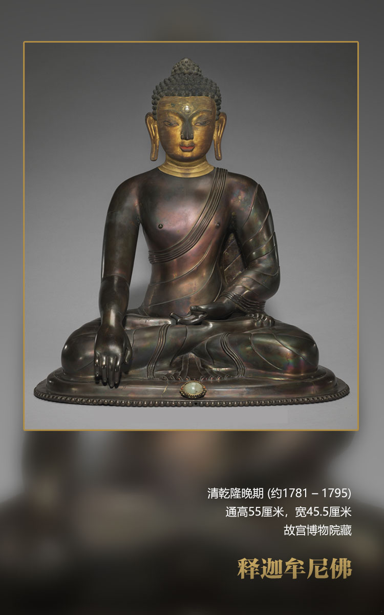 此尊釋迦牟尼佛寶相莊嚴(yán),螺發(fā)肉髻,眉間白毫嵌碩大的東珠,雙眉上揚(yáng),眼睛垂視,微微含笑,面龐俊朗,表現(xiàn)了其青年形象。面部及頸部泥金,身體挺拔,肩膀?qū)掗?;著袒右式袈裟,袈裟貼體,樣式簡潔。右手施觸地印,左手結(jié)禪定印,全跏趺坐于座墊上,底座缺失。