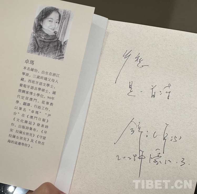 用餐結(jié)束后,卓瑪姐送我們每人一本她最新創(chuàng)作的詩集《昨天和明天都會回來》,并在扉頁親手寫上寄語,每人的寄語都不同。她在贈予帕洛扎的書上寫著“鄉(xiāng)愁,是一首詩”,給我寫著“走著走著別把自己走丟了”,給浩然寫著“別輕視 弱小的溫柔”……每條寄語,都寄托著卓瑪姐他鄉(xiāng)遇故知的溫暖與感動。對于西藏,我想卓瑪姐與帕洛扎一樣,都已經(jīng)把它當(dāng)成了自己深愛的故鄉(xiāng)。西藏承載著她兒時的記憶,小時候居住過的水泥廠、上學(xué)時走過的路、拉中的老師同學(xué)……那些或欣喜或難忘的往事,都是她與西藏這片土地最真實的情感連接,這種情懷,無法割舍,更不能割舍。(中國西藏網(wǎng) 記者/呂靜 易文文 姚浩然 王東)
