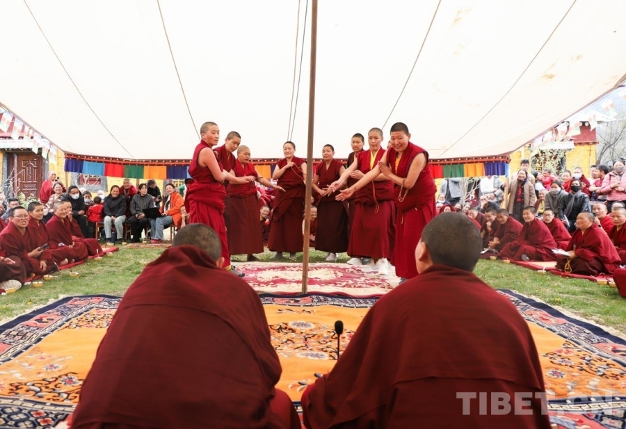 吉日寺是苯日神山上的一座苯教寺廟,位于林芝鎮(zhèn)卡斯木村。在吉日寺僧尼簡單的歡迎儀式后,西藏佛學院學員進入吉日寺主殿進行論文答辯交流,參加答辯交流的學員分別從研究背景與意義、研究內容、研究總結等方面進行自我論文介紹,并回答了相關提問。隨后,大家來到寺廟內的空曠之地開始激烈的辯經,剎那間害羞靦腆的尼眾頗有誓要一見高低的氣勢。