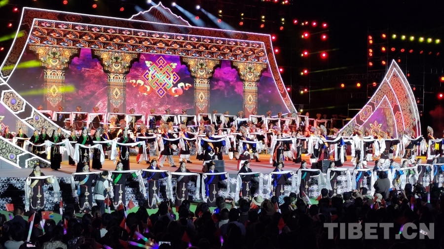 現(xiàn)場舞臺以藏族傳統(tǒng)手工藝品火鐮為造型,富有創(chuàng)造力地展示出盛德白玉的人文內(nèi)涵。演出現(xiàn)場,由省級非物質(zhì)文化遺產(chǎn)傳統(tǒng)舞蹈手指鍋莊改編的群舞《千年指舞鍋莊》一開場就引起全場歡呼。情景歌舞《精神永存》以金沙江“白格”堰塞湖為背景,講述了白玉縣上下齊心、共同奮戰(zhàn),最終打贏了這場應急救援戰(zhàn)的故事,彰顯了白玉兒女團結(jié)奮進、敢作善為的白玉精神。來自白玉縣登龍鄉(xiāng)的群眾身著本地傳統(tǒng)服飾,表演了非物質(zhì)文化遺產(chǎn)——登龍“卓欽”。男子步法粗狂豪邁、英勃剛健,唱腔渾厚、嗓音動人;女子舞蹈動作步法細膩傳神、輕盈瀟灑,唱腔明亮婉轉(zhuǎn)、嗓音甜美動人以及原始古樸,舞姿舒展,節(jié)奏明快,在舞步舞姿上的舒緩和節(jié)奏上的緩進,于粗獷中更沉穩(wěn),于質(zhì)樸中透中變化,在配男女對唱的優(yōu)美歌聲,極具地方特色,讓現(xiàn)場觀眾直觀地感受到了非遺獨特的文化魅力,一聲聲歡呼和喝彩掀起陣陣高潮。