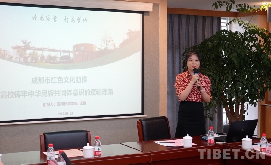 四川旅游學(xué)院四川省鑄牢中華民族共同體意識(shí)基地辦公室主任王瑞介紹了成都市豐富的紅色文化資源,從內(nèi)在關(guān)聯(lián)和實(shí)踐路徑兩個(gè)層面探討了紅色文化與中華民族共同體意識(shí)的契合度,以及助推高校鑄牢中華民族共同體意識(shí)的方式方法。