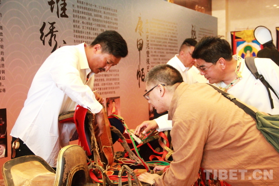 圖為“花開道孚 潤道有聲”道孚縣文化傳承發(fā)展座談會與會嘉賓在道孚縣非物質(zhì)文化遺產(chǎn)展上了解馬具制作工藝 攝影:劉莉