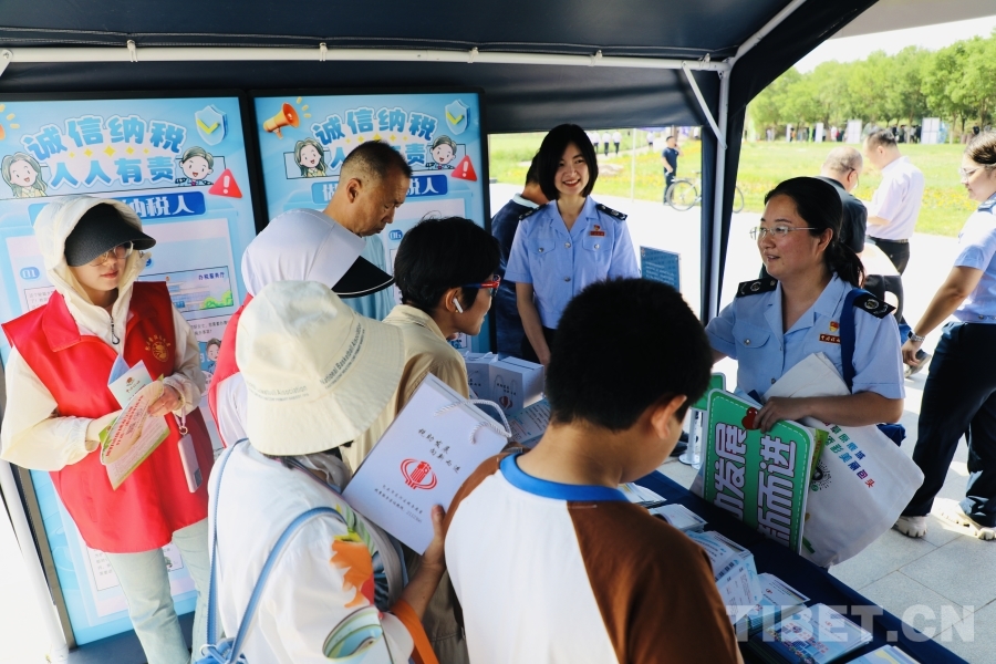 圖為稅務(wù)工作人員在向群眾講解 攝影:龍真多吉