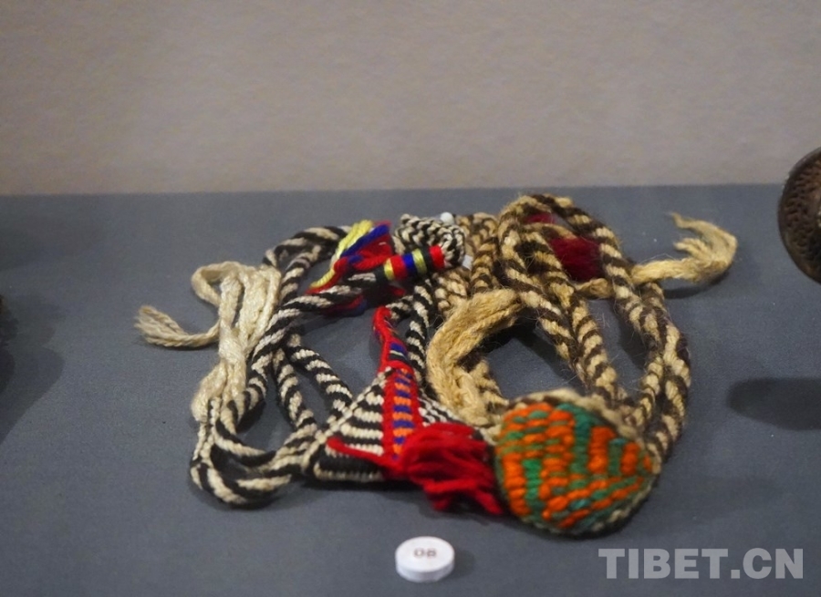 圖為“宗山號角——紀(jì)念西藏江孜抗英保衛(wèi)戰(zhàn)120周年主題展”展品——烏爾朵,一種牧民放牧牛羊用的皮制工具,可以把拳頭大小的石頭裹起來甩出去,用以驅(qū)趕或圍攏牲畜。攝影:王茜