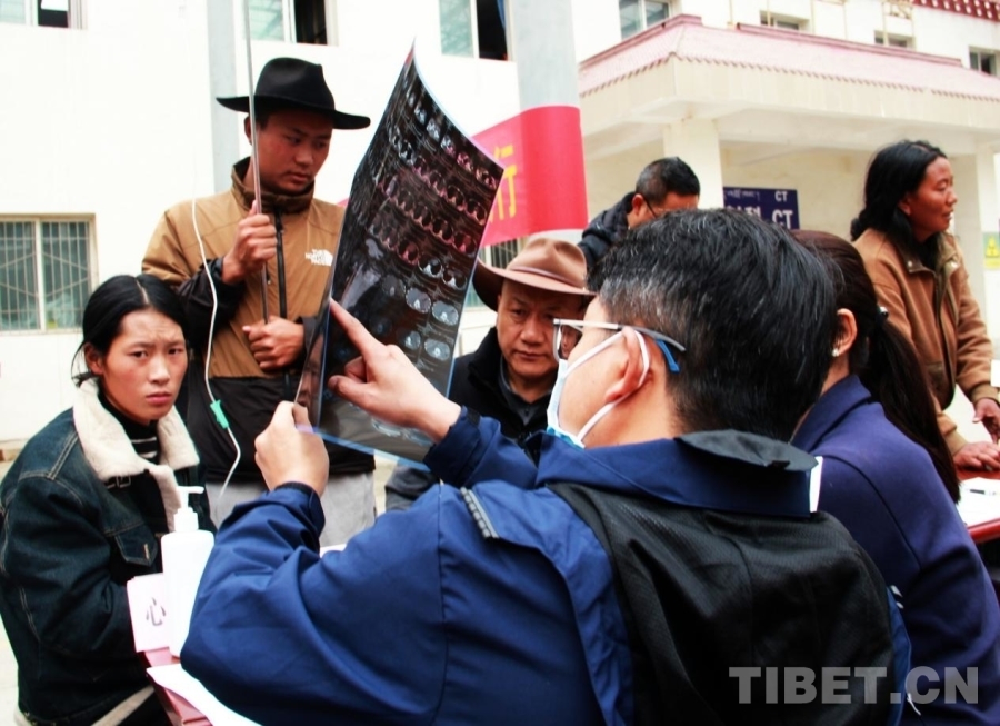圖為2024“同心·共鑄中國心”甘孜行大型公益活動石渠縣義診現(xiàn)場,中國人民解放軍總醫(yī)院第一醫(yī)學(xué)中心肝膽胰外科主任醫(yī)師王兆海正在查看患者帶來的片子 攝影:劉莉
