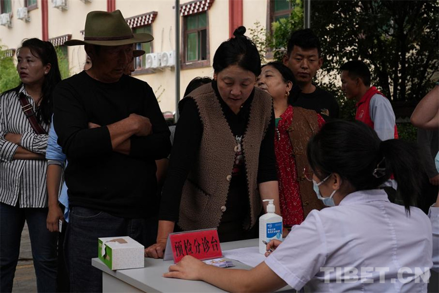 圖為巴塘縣群眾在預(yù)檢分診臺(tái)排隊(duì)領(lǐng)取病科條 攝影:姚浩然