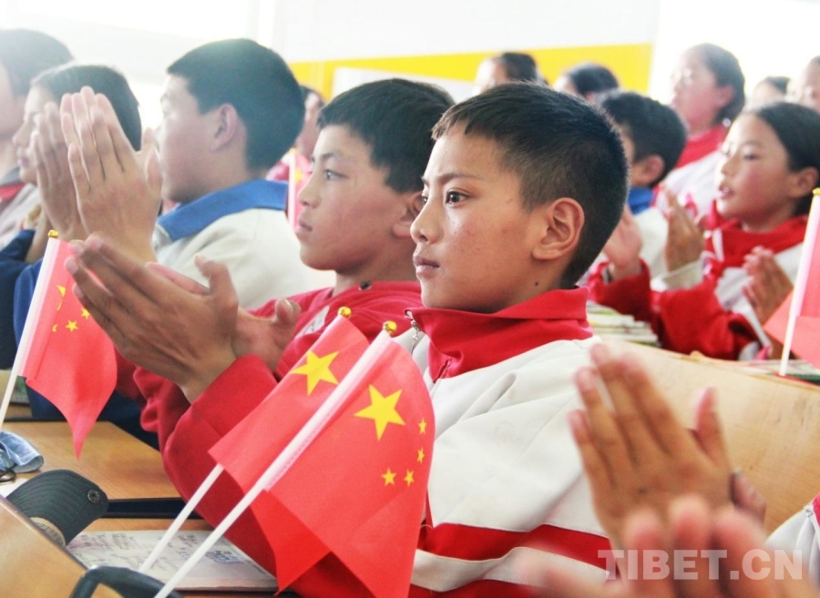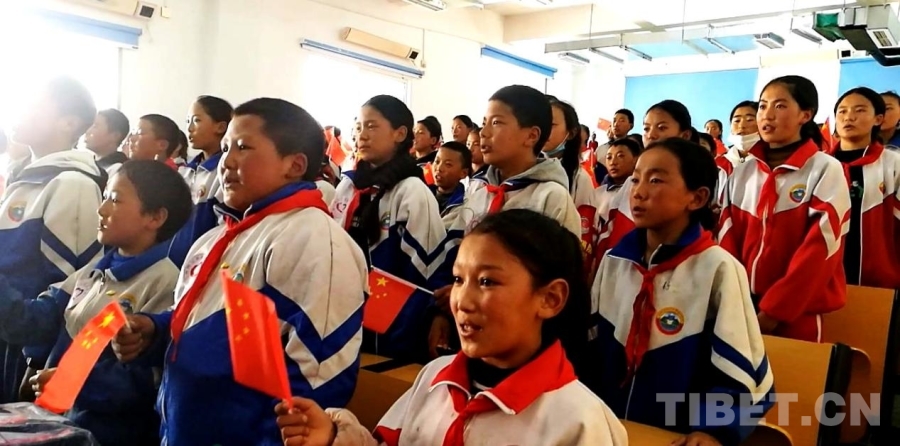 圖為四川省甘孜州石渠縣第二完全小學(xué)學(xué)生代表與醫(yī)療專家們一起高唱國(guó)歌 攝影:劉莉