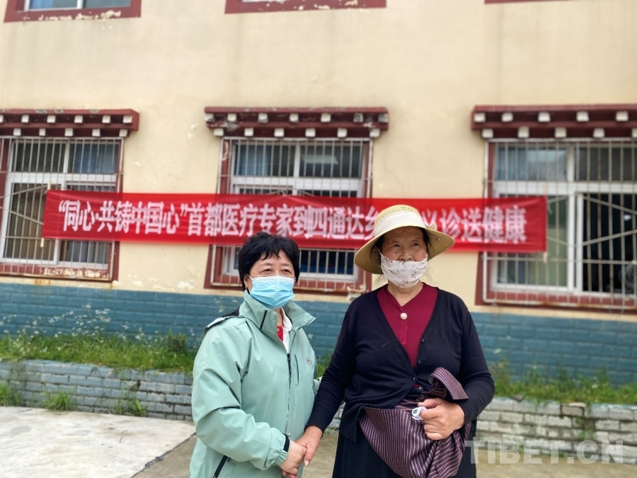 圖為當(dāng)?shù)?1歲村民一手兜著從藥房領(lǐng)取的藥品,另一只手熱情地握住活動志愿者航空總醫(yī)院產(chǎn)科武海榮醫(yī)生的手,表達(dá)著她深深的謝意 攝影:格桑