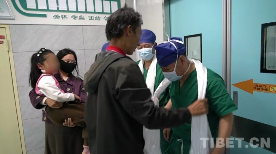 圖為7月10日,手術(shù)成功后,患兒家長為醫(yī)療專家獻(xiàn)上哈達(dá)表達(dá)感謝 攝影:周晴晴