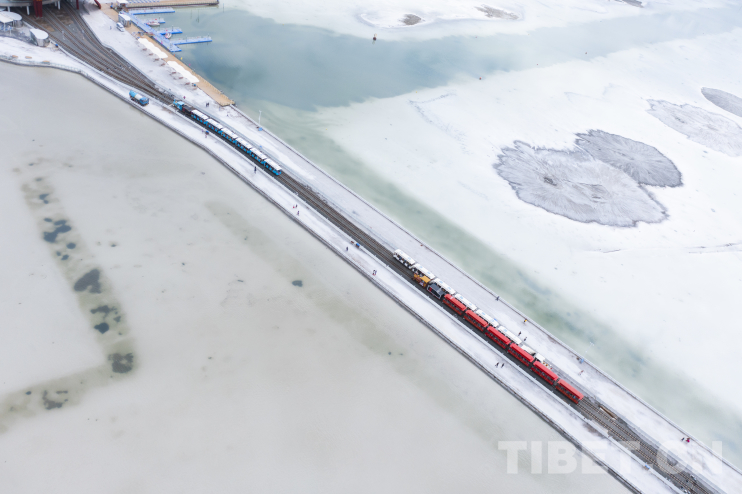 圖為航拍茶卡鹽湖小火車。攝影:趙振宇