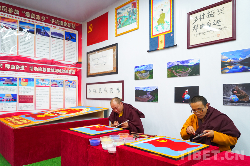中國西藏網(wǎng)訊 2024年那曲恰青賽馬節(jié)暨第三屆“鄉(xiāng)村振興 那曲奮進(jìn)”活動(dòng)現(xiàn)場(chǎng),兩位來自那曲市索縣加勤鄉(xiāng)尼瑪林寺的僧人用彩砂繪制工藝?yán)L制黨徽、國旗、國徽等彩砂作品,深切表達(dá)藏傳佛教僧人愛黨愛國愛教之情,用實(shí)際行動(dòng)踐行聽黨話、感黨恩、跟黨走,加深信教群眾對(duì)于祖國的熱愛。