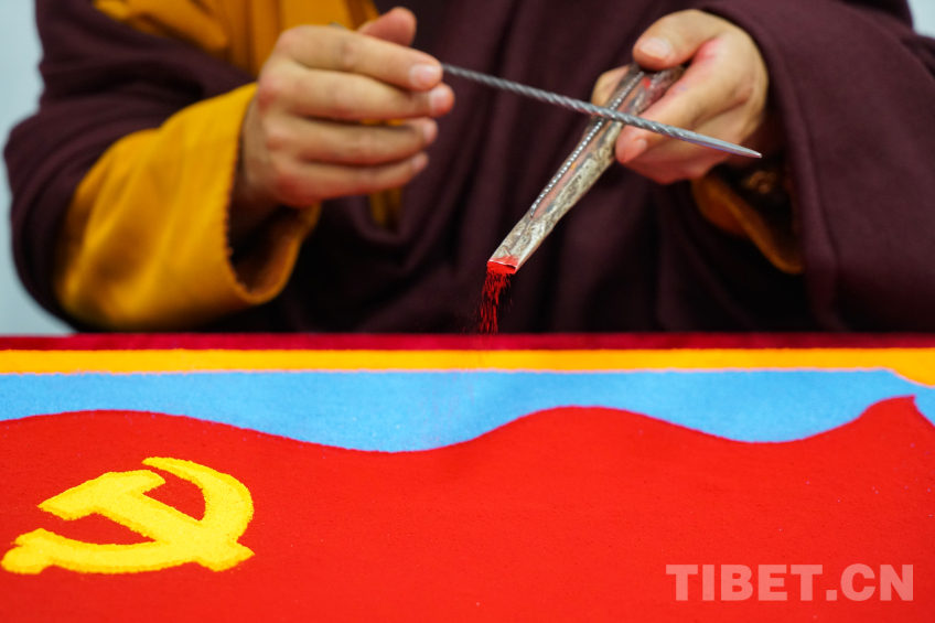 圖為尼瑪林寺僧人正在用手中的彩砂繪制黨旗 攝影:趙振宇