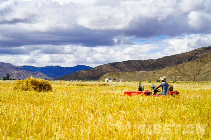 圖為正在青稞田里駕駛農(nóng)具的歐珠 攝影:王淑